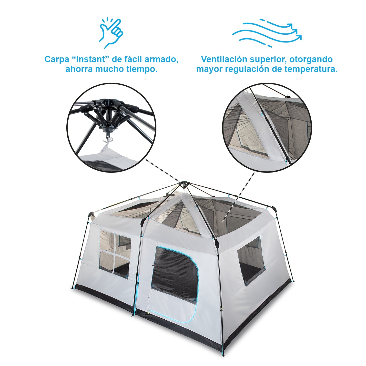 | Incluye | Carpa, estructura instantánea, estacas, vientos y bolso de transporte, División dormitorios |